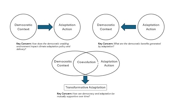Figure 1 presents the opportunity opened by considering the impacts of adaptation on development and specifically on democratic context. It is only by combining current focus on the ways in which democratic context constrains adaptation action – with additional insight form the ways in which adaptation actions also shape democratic context that these coevolving systems can be understood. It is in this understanding that targeted efforts at enhancing more inclusive, accountable and evidence based working can bring about transformative adaptation.