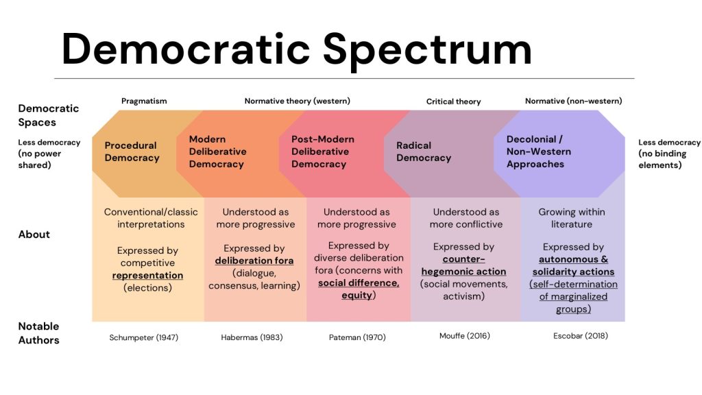 In this approach, the democratic spectrum is composed from five traditions in political theory: procedural democracy, modern deliberative democracy, post-modern deliberative democracy, radical democracy and decolonial approaches.