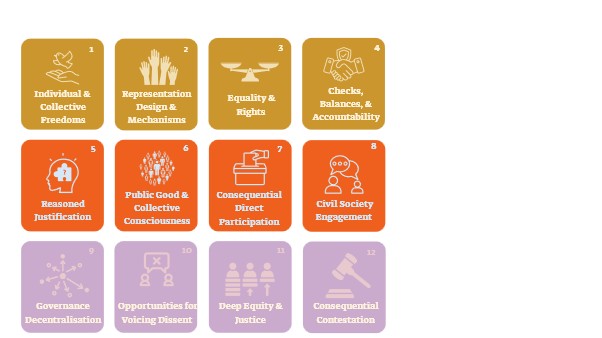 Figure 3 presents a first order unpacking of democracy into 12 qualities. Each has considerable work behind it. Each remains quite abstract but provides a mechanisms to bridge between the range of options presented by the democratic spectrum and actual action on the ground. These qualities can help guide conversations with practitioners, policy makers and local actors. These should focus on providing examples of specific qualities. These examples will likely be viewpoint and context specific.